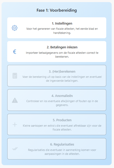 Belangrijk!​ Voordat u kunt starten met de fiscale attesten, hebben wij een backup nodig van uw Reinaert database.​ Eens wij de backup overgezet hebben, kunt u verder gaan met de volgende stappen.
