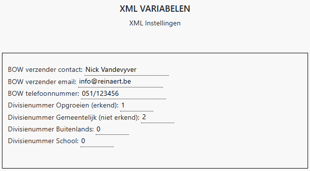 2. Optioneel: Indien u de bestanden aan BELCOTAX wil leveren, vul dan ook de xml variabelen in.De gegevens moeten die van de verzender zijn, zodat deze persoon gecontacteerd kan worden indien er problemen zijn.Het is ook belangrijk om de divisienummers in te geven als u meerdere bestanden vanuit verschillende softwarepaketten naar BELCOTAX zult sturen. U kunt hiervoor intern afspreken wie welk nummer gebruikt, zodat de bestanden elkaar niet zullen overschrijven, bijvoorbeeld: