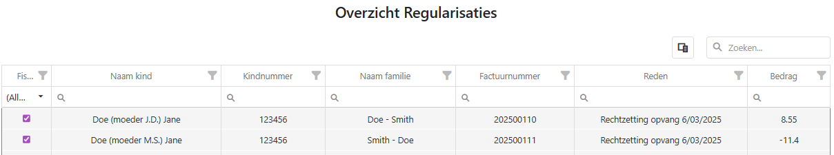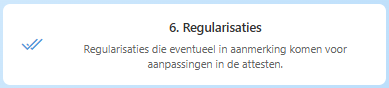In het tabblad “regularisaties” krijgt u een overzicht van alle gefactureerde regularisaties en of deze fiscaal aftrekbaar zijn. Als er in de linkerkolom een vinkje staat, wil dit zeggen dat het fiscaal aftrekbaar is. Indien er geen vinkje is, is de regularisatie niet fiscaal aftrekbaar.
