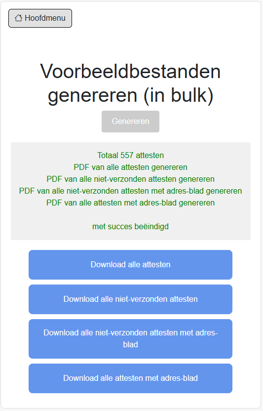 In deze stap genereer je een bulkbestand van de voorbeeldattesten. Dit bestand is een pdf-bestand die een combinatie van alle pdf’s uit vorige stap. Zo kan je makkelijk alle attesten aan de hand van 1 bestand makkelijk controleren.