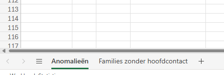 Soms zijn gegevens niet correct of onvolledig. Je kan dit bekijken door een Excel met anomalieën te downloaden via de knop “Anomalieën”. De Excel is onderverdeeld in 2 tabbladen. Er is een tabblad voor “Families zonder hoofdcontact” en een tabblad voor algemene “Anomalieën”.