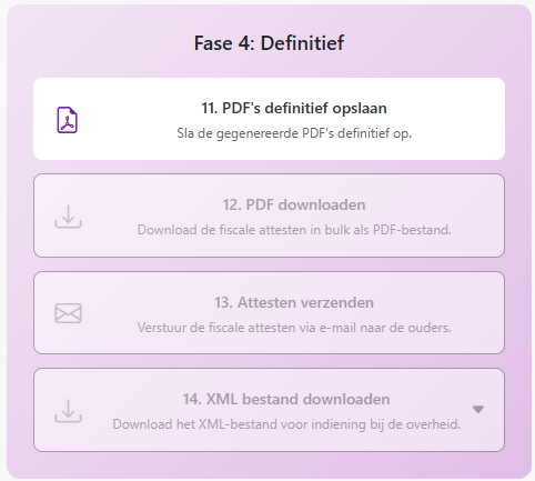 Nadat je fase 2 afgerond hebt, kom je aan bij fase 3. In fase 3 kan je voorbeeldattesten genereren, downloaden, en indien gewenst ook naar de ouders doorsturen.