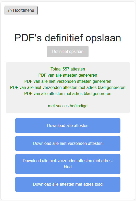 Je bent aangekomen aan de laatste fase. In deze fase worden de pdf’s definitief opgeslagen. Eens de pdf’s definitief opgeslagen zijn, kunnen de attesten niet meer herberekend of aangepast worden.